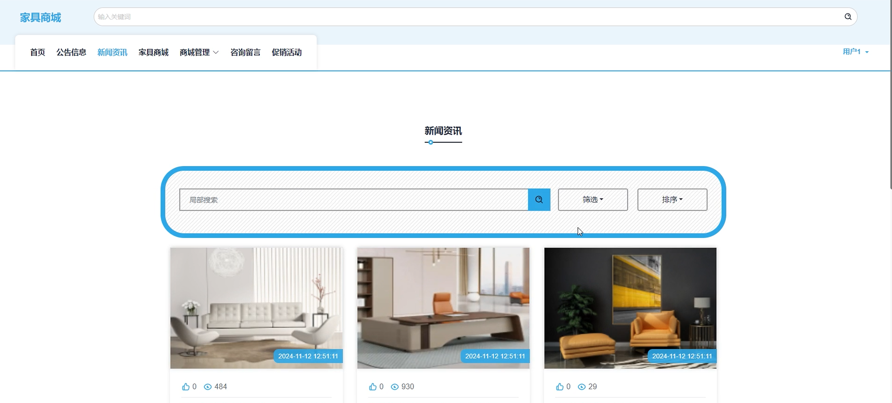 家具商城:展示所有后台发布的家具商城列表信息,点击可查看是家具详情信息。可进行商品购买、领取优惠券、点赞、收藏以及发表评论。家具商城列表如图5-4所示。