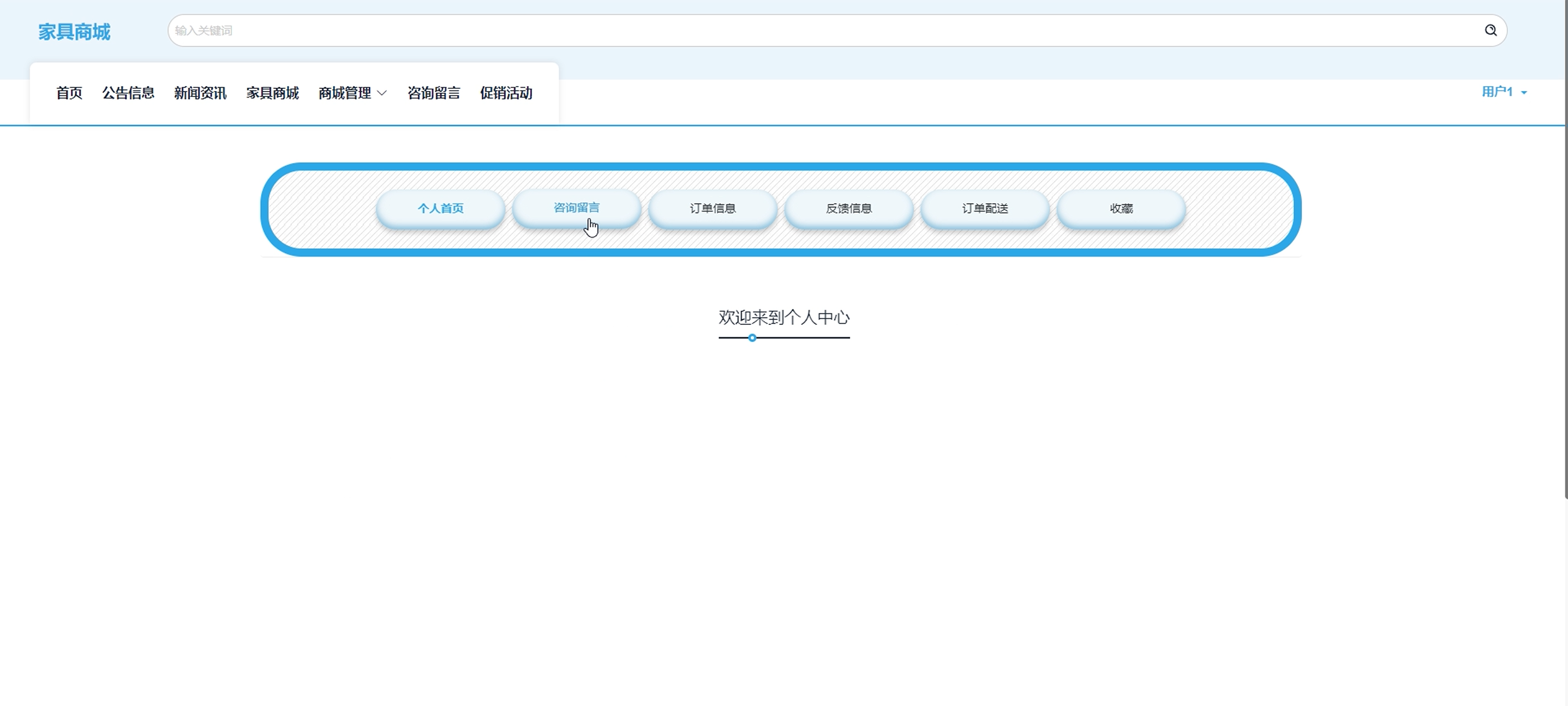(4)个人中心:包含个人首页、咨询留言、订单信息、反馈信息、订单配送、收藏等。个人首页:展示用户的个人信息和快捷入口。咨询留言:用户可以向商家提出咨询或建议。订单信息:查看订单详情。反馈信息:提交使用过程中遇到的问题或建议。订单配送:跟踪订单的物流信息。收藏:保存感兴趣的家具商品。