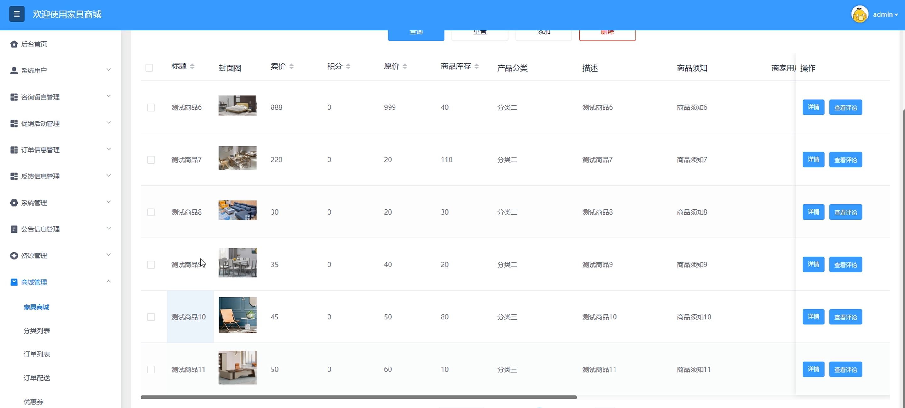 家具商城:管理员全面管理商品信息,支持新增、编辑、删除商品。家具商城如图5-12所示。
