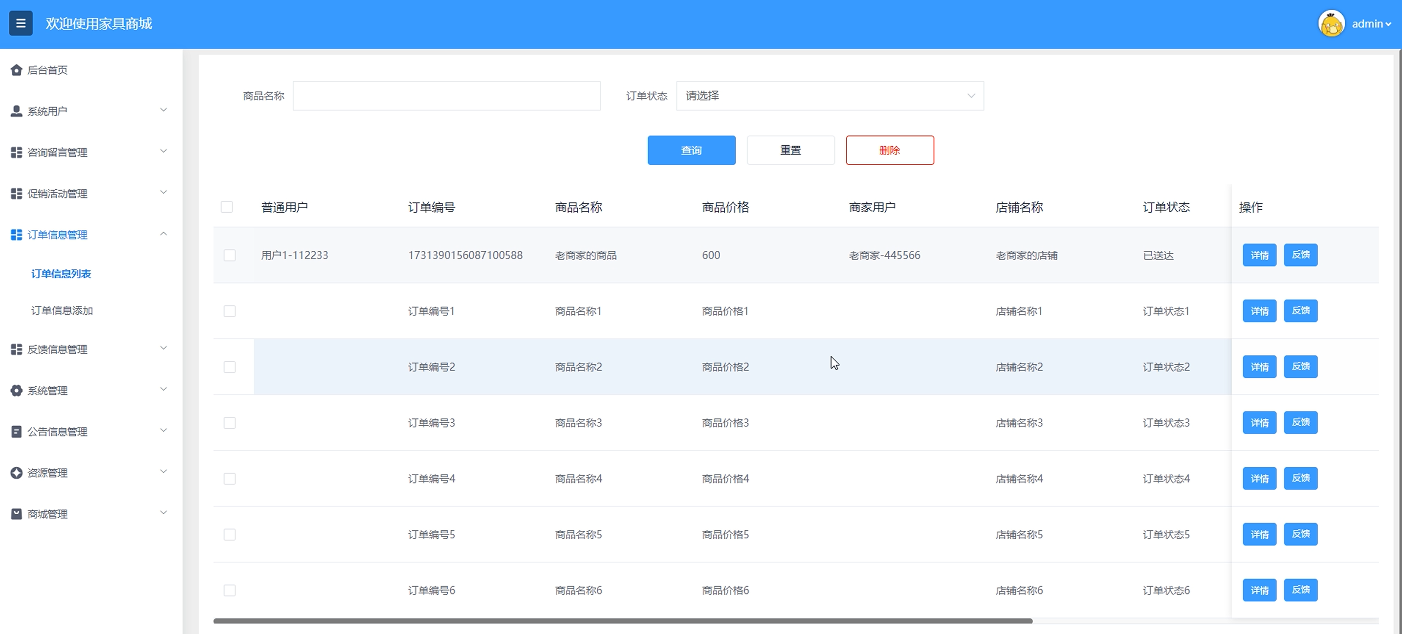 (6)订单信息管理:管理员监督所有订单的处理情况,并可进行查询、重置、删除等操作。