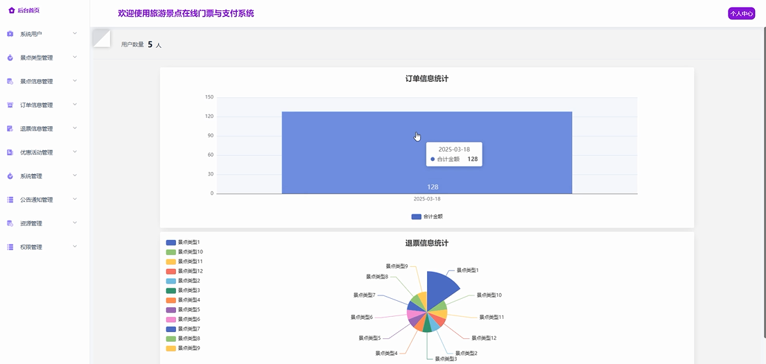 - 后台首页:后台首页展示了各类统计图,包括订单信息统计和退票信息统计,帮助管理员实时了解网站运营情况。