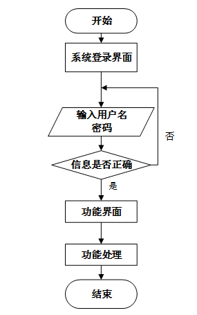 用户首先进入系统登录界面,输入用户名和密码后,系统验证信息是否正确。若验证失败,返回登录界面重新输入,若验证成功,则进入功能界面,执行相应功能处理后结束操作流程。操作流程如下图所示。