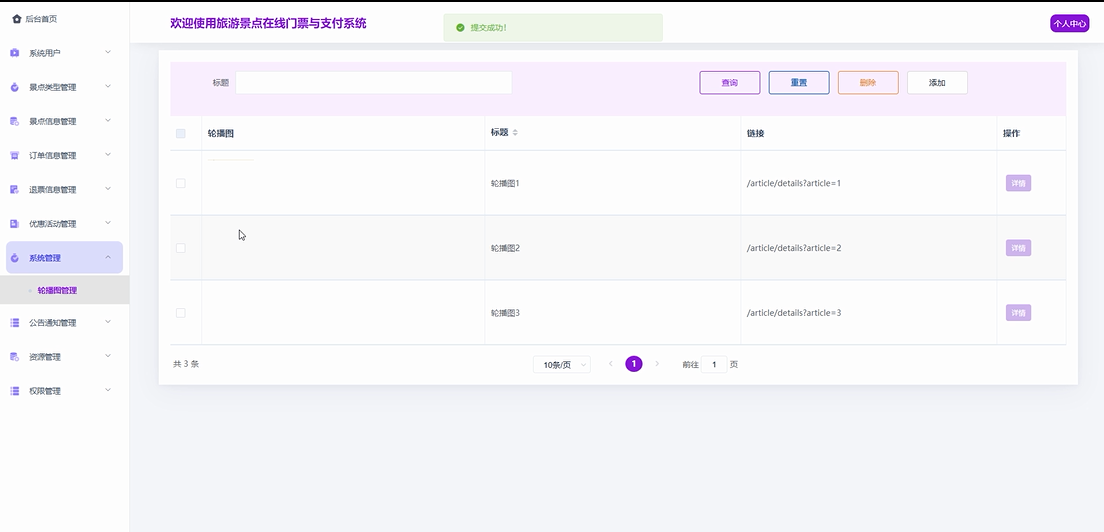 - 系统管理:系统管理员有权限查看、删除或添加轮播图管理内容,保证平台首页轮播图内容的及时更新和优化,提高用户体验。