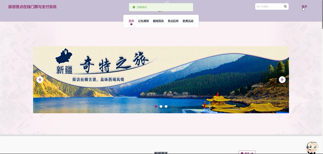 - 首页:首页展示了轮播图、新闻资讯以及推荐景点信息。推荐景点是根据用户平时的点击偏好进行排序的,确保用户能快速看到他们感兴趣的内容。此外,用户可以点击客服头像进行实时咨询,获取帮助和解答。