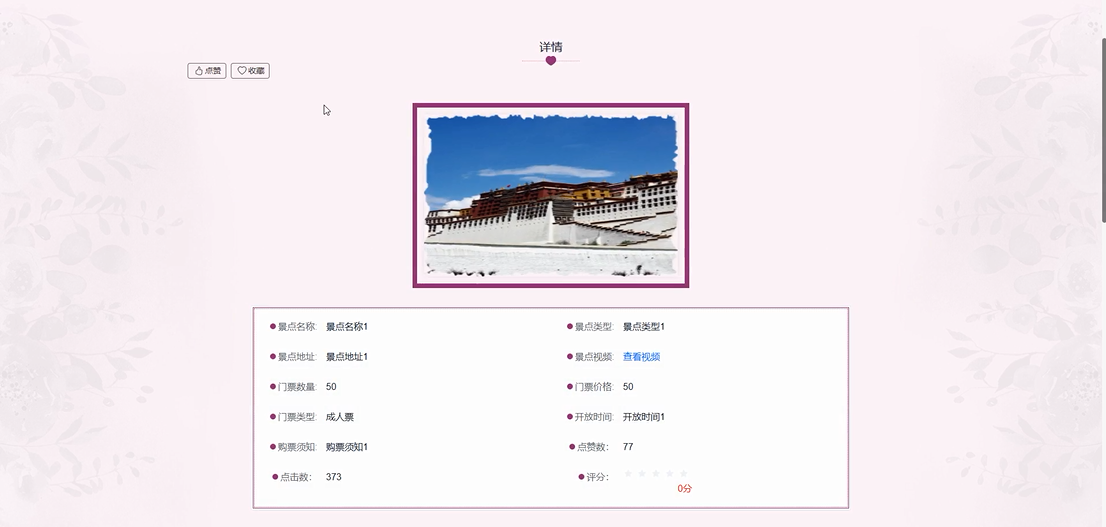 - 景点信息:用户可以查看景点的详细信息和相关视频,帮助用户了解景点的基本情况、特色与设施等。此外,用户还可以对景点进行点赞、收藏和评论。若有意向参观某景点,用户可直接进行购票。