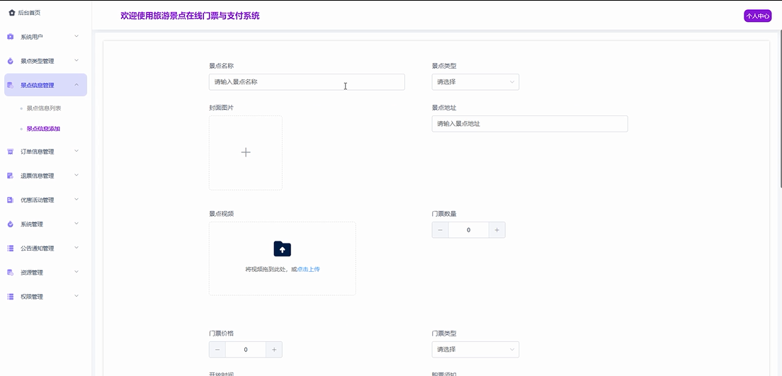This system is an online ticket and payment management platform for tourist attractions developed based on the SpringBoot framework, aiming to provide users with convenient and efficient online ticket purchasing services. Through the platform, users can view information about scenic spots, including detailed introductions, videos, and related comments, to help them make reasonable choices. At the same time, the system provides personalized recommendations based on the user's browsing history and preferences, enhancing the user experience. The platform also supports online payment, where users can directly purchase tickets through the system and have a refund function, making it easy for users to return or exchange tickets when needed. In addition, the system provides a simple and easy-to-use management backend, where administrators can effectively manage attraction information, promotional activities, announcements and notifications, ensuring timely updates and accurate publication of information.