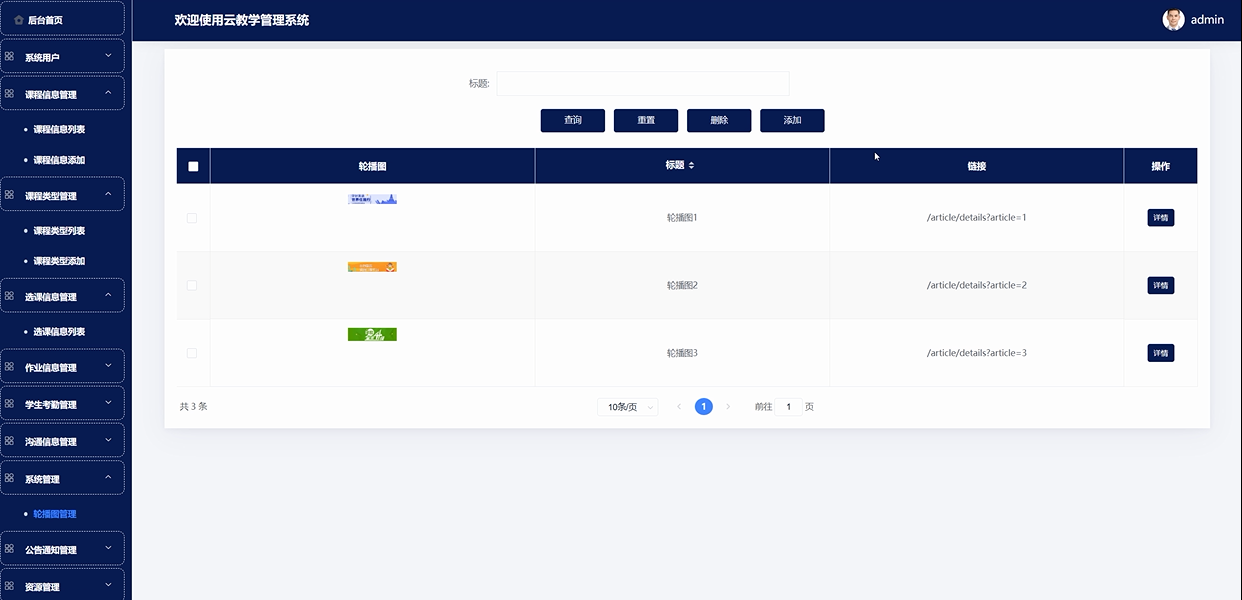 - 系统管理:管理员负责轮播图的管理,包括添加、删除、查询轮播图内容,并查看轮播图的详细信息。