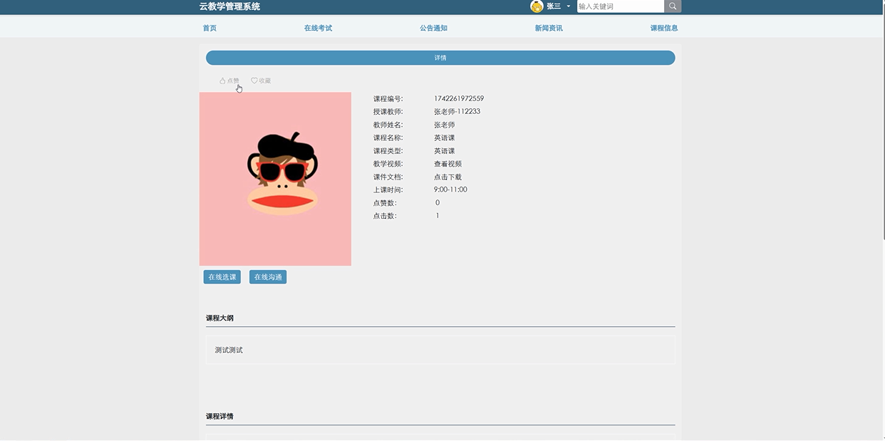 - 课程信息:学生可以查看课程的详细信息,包括课程介绍、课程大纲等,同时可以点赞、收藏和评论课程内容。如果对某门课程感兴趣,还可以在线选择课程。