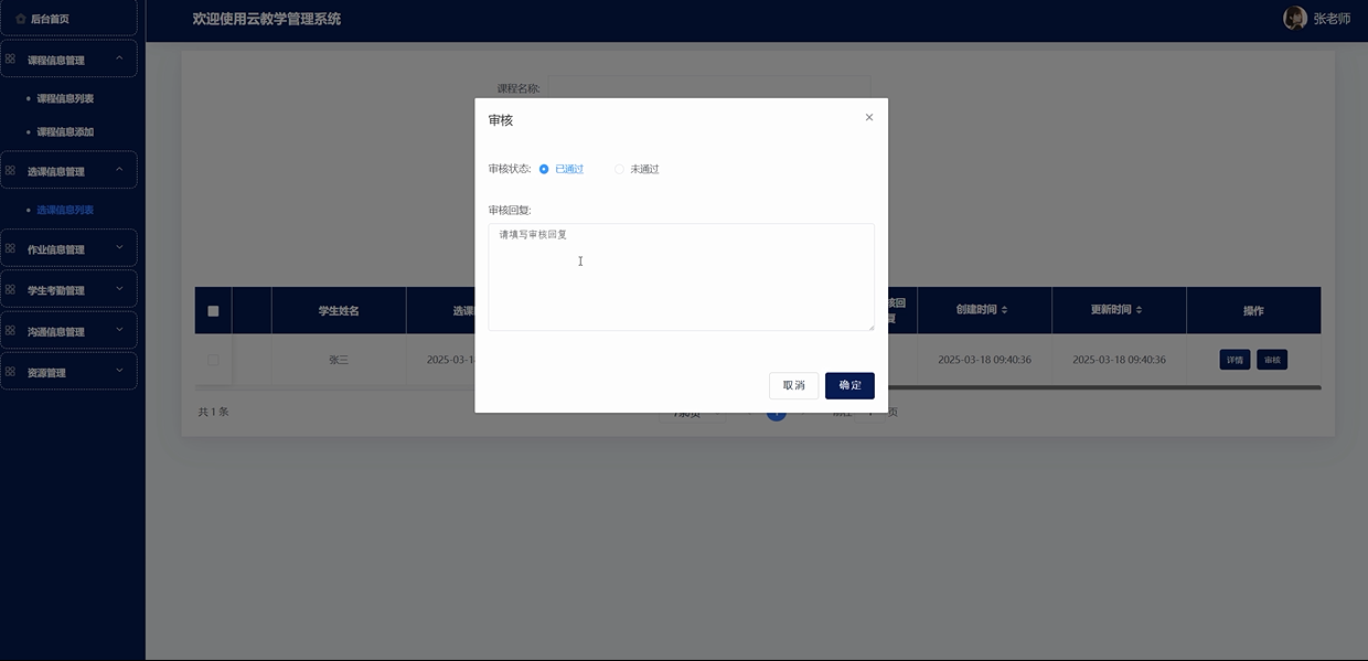 - 选课信息管理:教师可以查看学生选课的具体信息,了解每个学生的选课情况。教师有权限审核学生的选课请求,并根据需要进行调整。