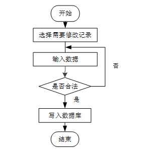 用户首先选择需要修改的记录,输入修改后的数据,系统判断输入数据是否合法。若数据不合法,提示重新输入,若数据合法,则将修改后的数据写入数据库,完成操作后流程结束。修改信息流程图如下图所示。
