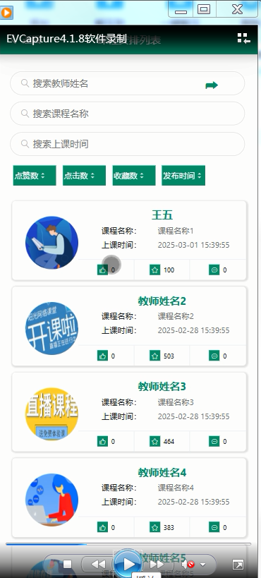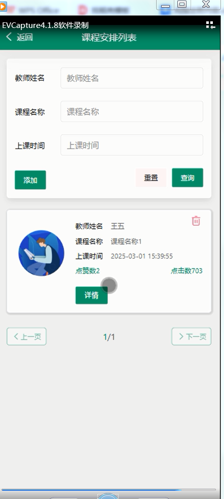 用户进入在课程安排页面,浏览课程名称、上课时间等基本信息。通过搜索栏输入关键词或筛选条件,快速定位课程安排界面。可以进行点赞、收藏和评论。课程安排界面如图5-1所示。