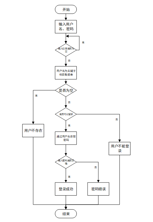 用户输入用户名和密码后,系统先检查输入是否为空,再验证用户名是否存在,若存在则通过用户名获取密码并校验。若密码正确则登录成功,否则提示密码错误。若用户名不存在或无法登录,提示用户操作无效。如图3-5所示。