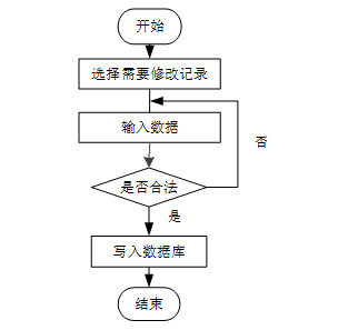 用户首先选择需要修改的记录,输入修改后的数据,系统判断输入数据是否合法。若数据不合法,提示重新输入;若数据合法,则将修改后的数据写入数据库,完成操作后流程结束。修改信息流程图如图3-8所示。