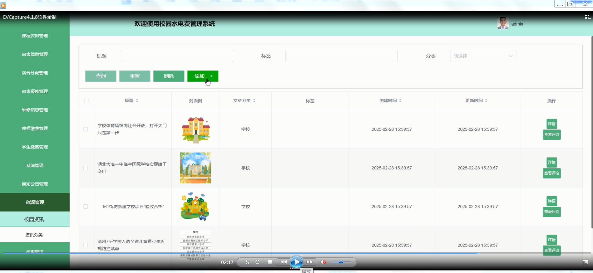 管理员在资讯管理页面查看所有校园资讯文章,支持新增、编辑和删除操作。点击“新增”填写标题、内容并上传图片,选择分类后发布。可批量删除过期文章。资讯管理界面如图5-12所示。