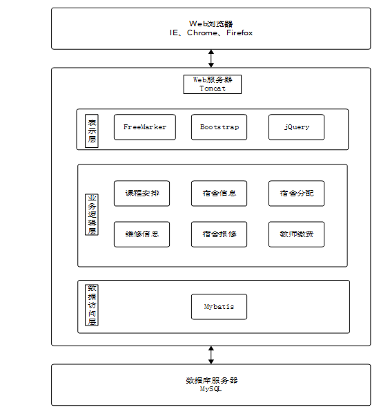 系统由表现层、业务逻辑层、数据访问层和数据库服务器组成。表现层通过浏览器(如IE、Chrome、Firefox)与用户交互,采用FreeMarker、Bootstrap、jQuery等技术实现界面呈现。业务逻辑层负责处理系统的核心业务逻辑,通过分模块设计实现功能分离。数据访问层使用MyBatis框架连接数据库,执行数据的增删改查操作。数据库服务器采用MySQL进行数据存储和管理,为系统提供稳定的数据库支持。整个架构通过Tomcat服务器完成用户请求的接收和处理,确保系统的高效运行[8]。整个系统架构如图4-1所示。