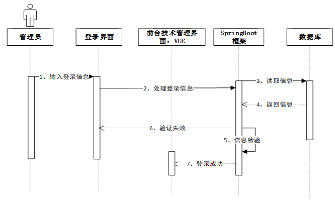 管理员输入登录信息后,登录界面将信息传递至前台管理界面,随后通过SpringBoot框架读取数据库中的用户信息并返回。系统验证信息,若验证成功则登录成功,若验证失败则返回错误提示。登录时序图如图4-4所示。