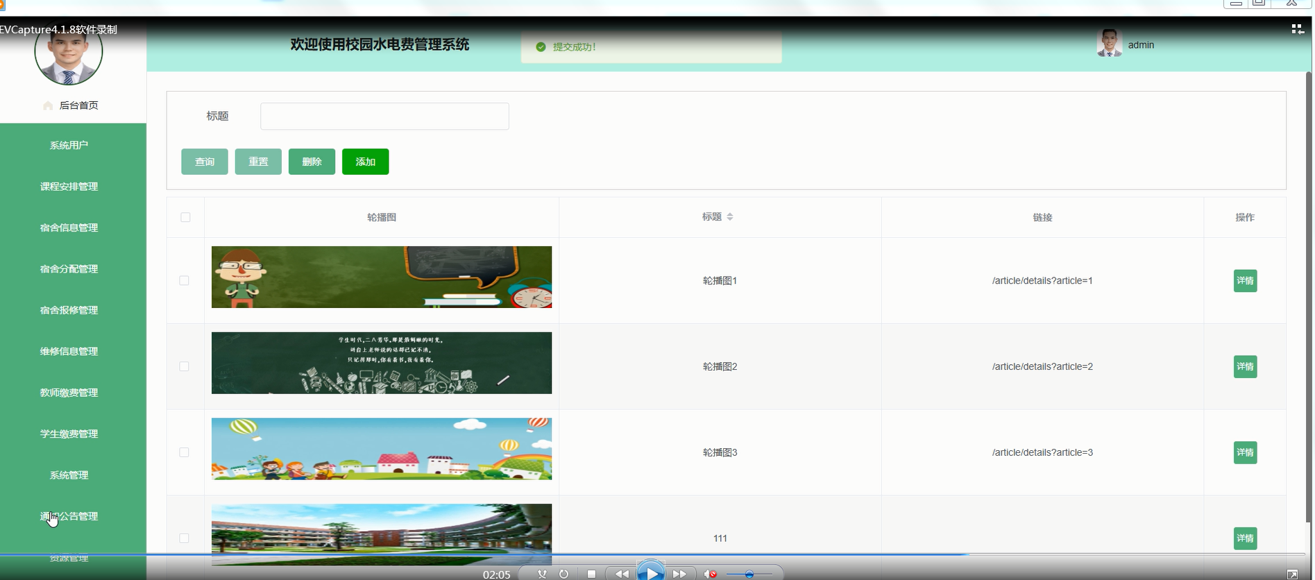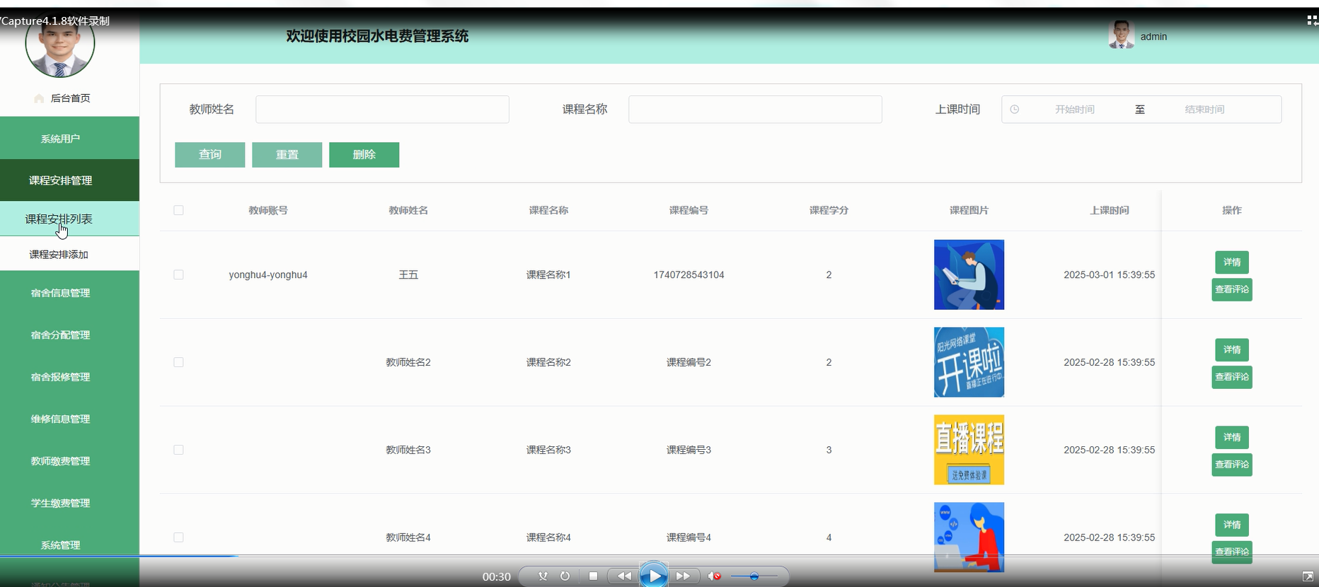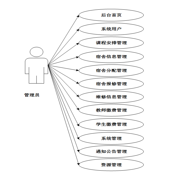 管理员可以管理后台首页,维护系统用户信息,安排课程,处理宿舍信息和分配,及时管理宿舍报修和维修信息,监督教师和学生的缴费情况,进行系统管理(如轮播图和通知公告),以及管理校园资讯和资讯分类,全面提升管理效率。