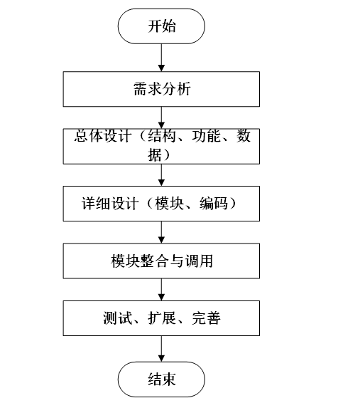 系统开发流程的主要步骤,从需求分析到系统完成的全过程。流程包括需求分析、总体设计(结构、功能、数据)、详细设计(模块、编码)、模块整合与调用,以及测试、扩展和完善,最终完成系统的开发。本系统的开发流程如图3-4所示