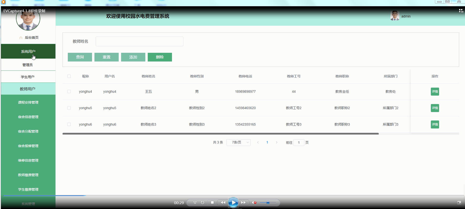 在“系统用户”模块下,管理员可以管理系统上的三类用户:管理员、学生用户和教师用户。管理员可以进行用户的增、删、改、查操作,包括设置权限、修改用户信息等。系统用户界面如图5-8所示。