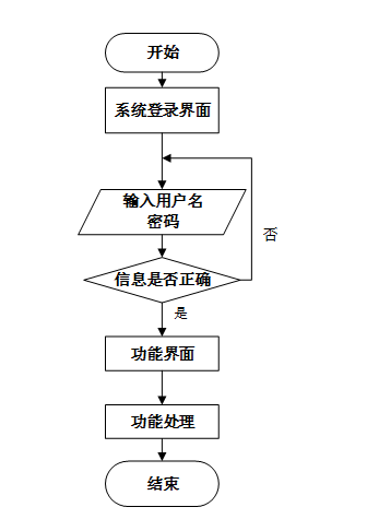 用户首先进入系统登录界面,输入用户名和密码后,系统验证信息是否正确。若验证失败,返回登录界面重新输入;若验证成功,则进入功能界面,执行相应功能处理后结束操作流程。操作流程如图3-6所示。