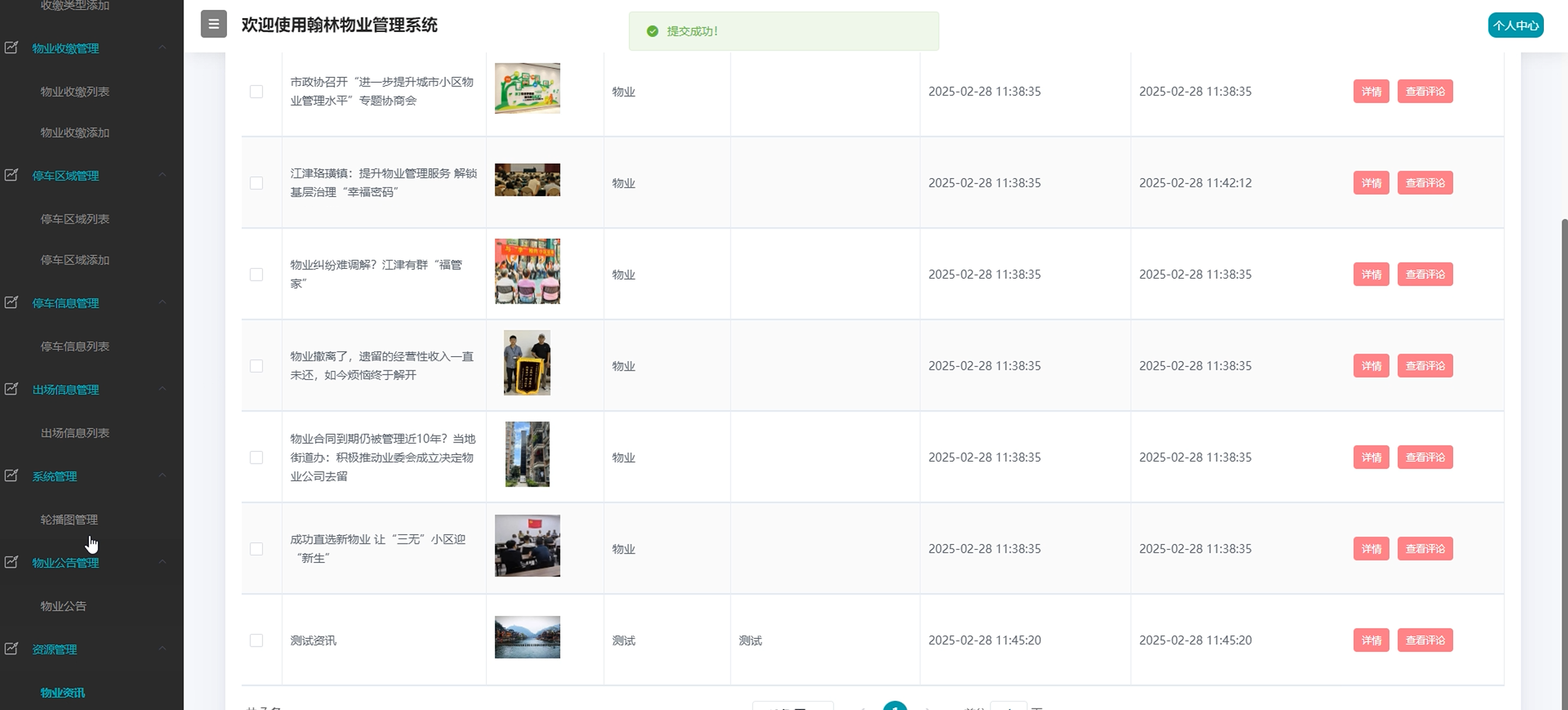 资源管理:管理员可对物业资讯、资讯分类进行管理,进行增删改查操作,物业资讯支持标题、标签、分类搜索,可点击详情和查看评论进行查阅;资讯分类支持类型名称搜索。