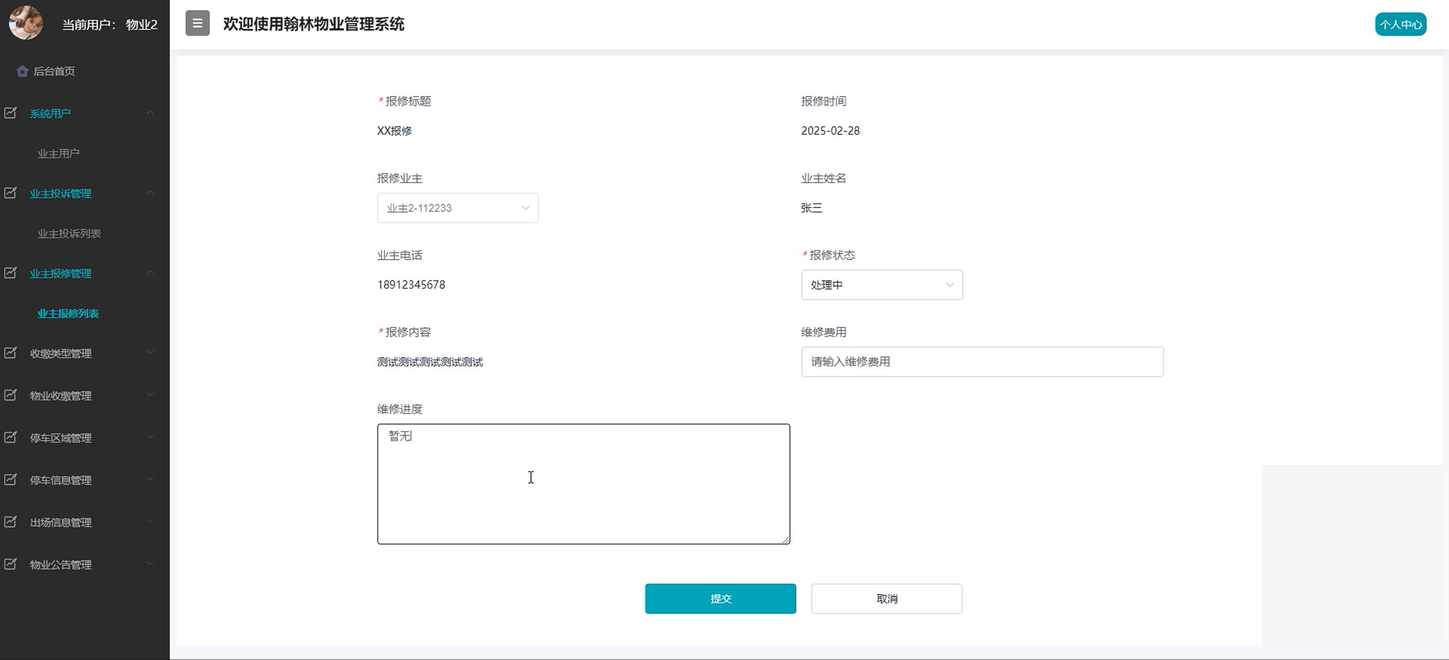 物业用户可以查看业主提交的报修申请,分配报修任务给维修人员,跟踪报修进度,并记录报修完成情况。其界面如下图所示。