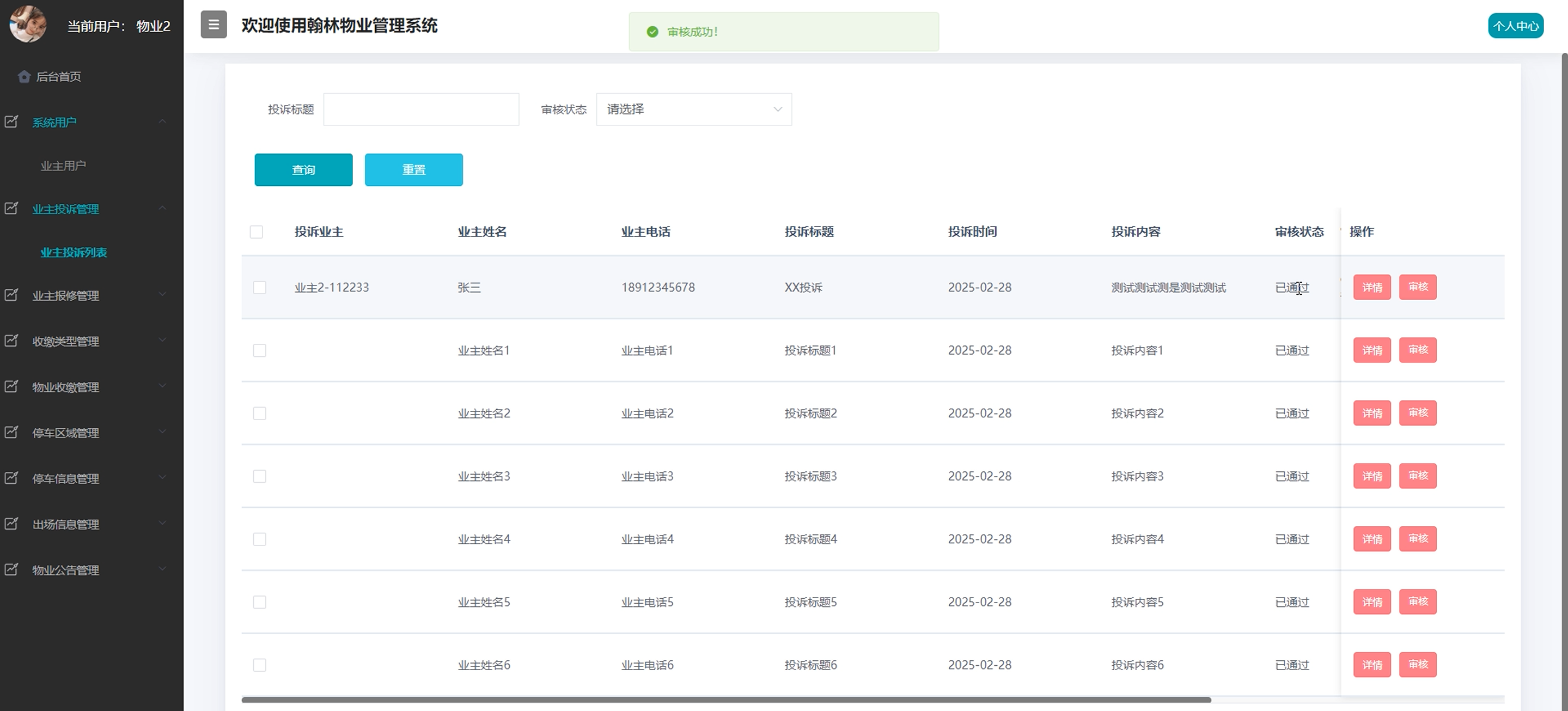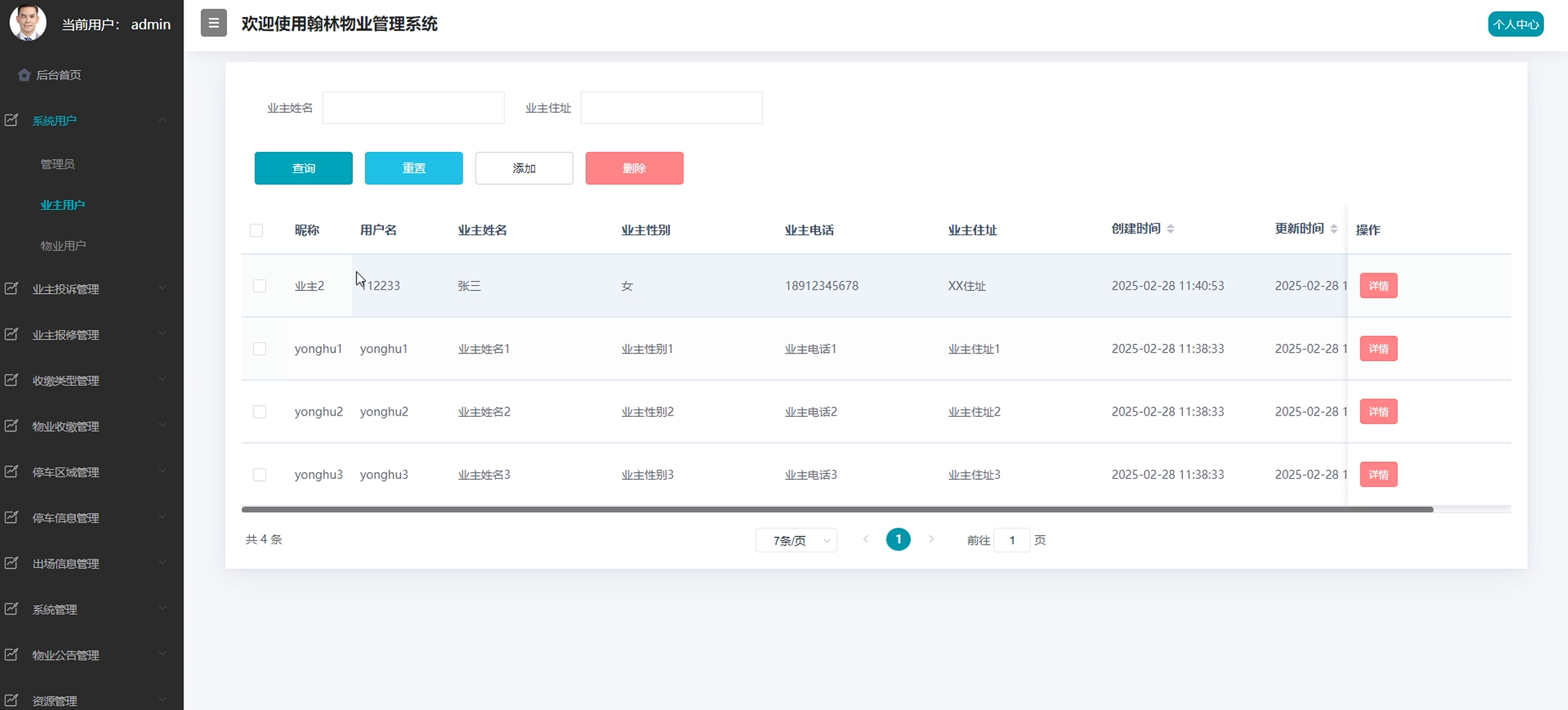 系统用户管理:物业用户可以查看业主的基本信息,包括姓名、联系方式、房屋信息等,并对业主信息进行查询、修改和删除操作。