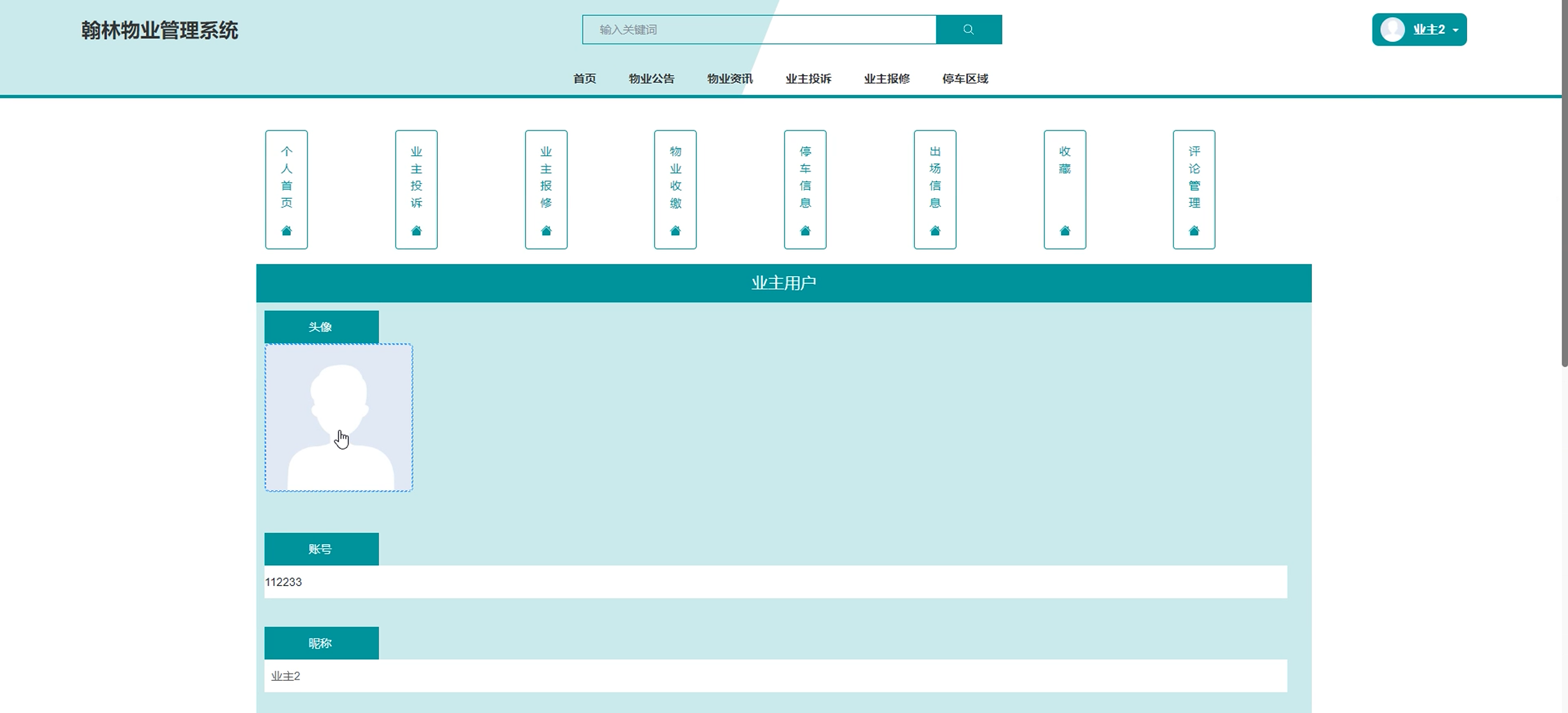 个人中心:用户可以查看和管理个人首页、业主投诉、业主报修、物业收缴、停车信息、出场信息、收藏、评论管理的所有信息。