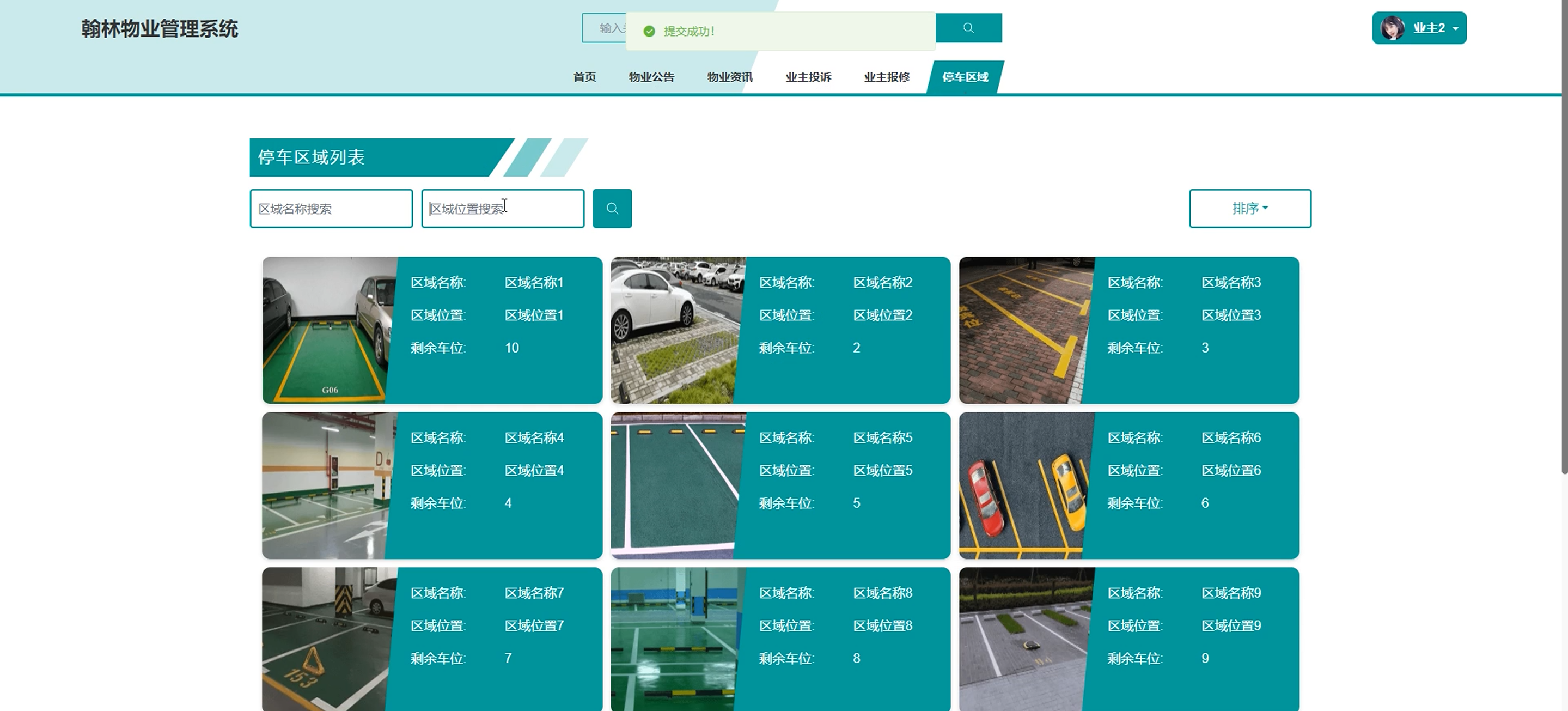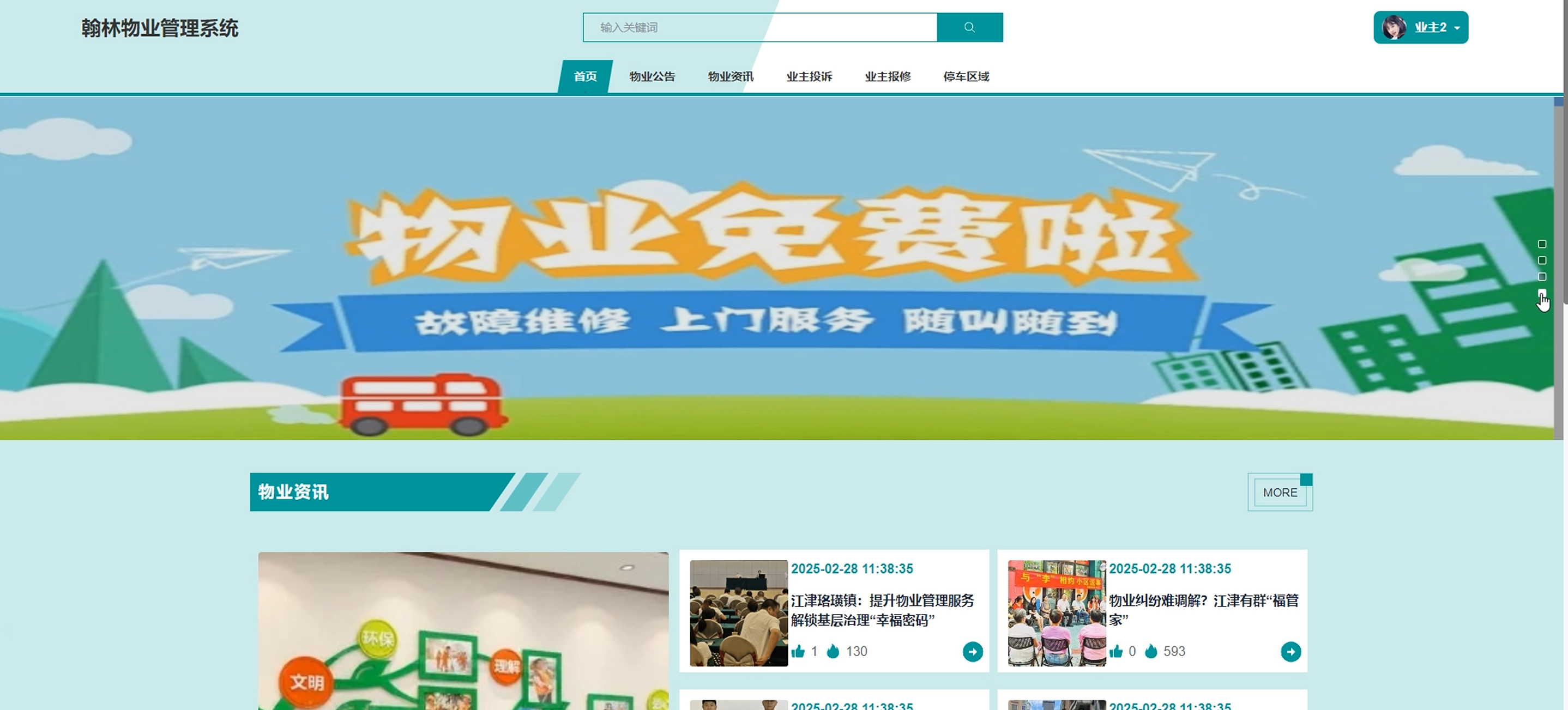 前台首页:业主用户注册登录系统后,可以在首页查看并使用轮播图、物业资讯、停车区域快捷导航按钮。