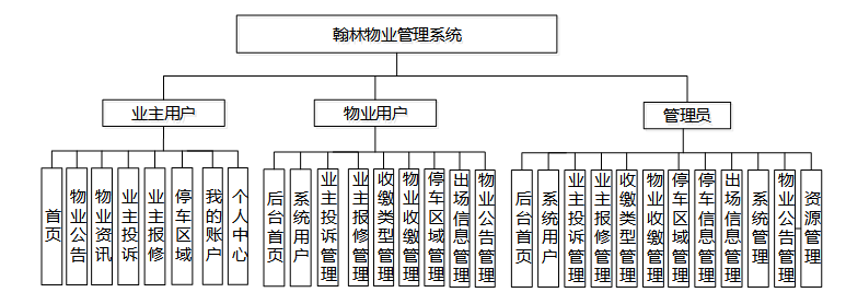 为解决上述问题,本研究提出基于Spring Boot框架的翰林物业管理系统的设计与实现。该系统采用Java语言开发,结合MySQL数据库进行数据存储与管理,旨在通过信息化手段提升物业管理的效率和服务质量。系统主要面向三类用户:业主用户、物业用户和管理员。业主用户可以通过系统查询物业费用、提交报修申请、查看公告和投诉反馈;物业用户负责处理报修、投诉处理等日常事务;管理员则负责用户权限分配、数据统计分析以及系统维护。