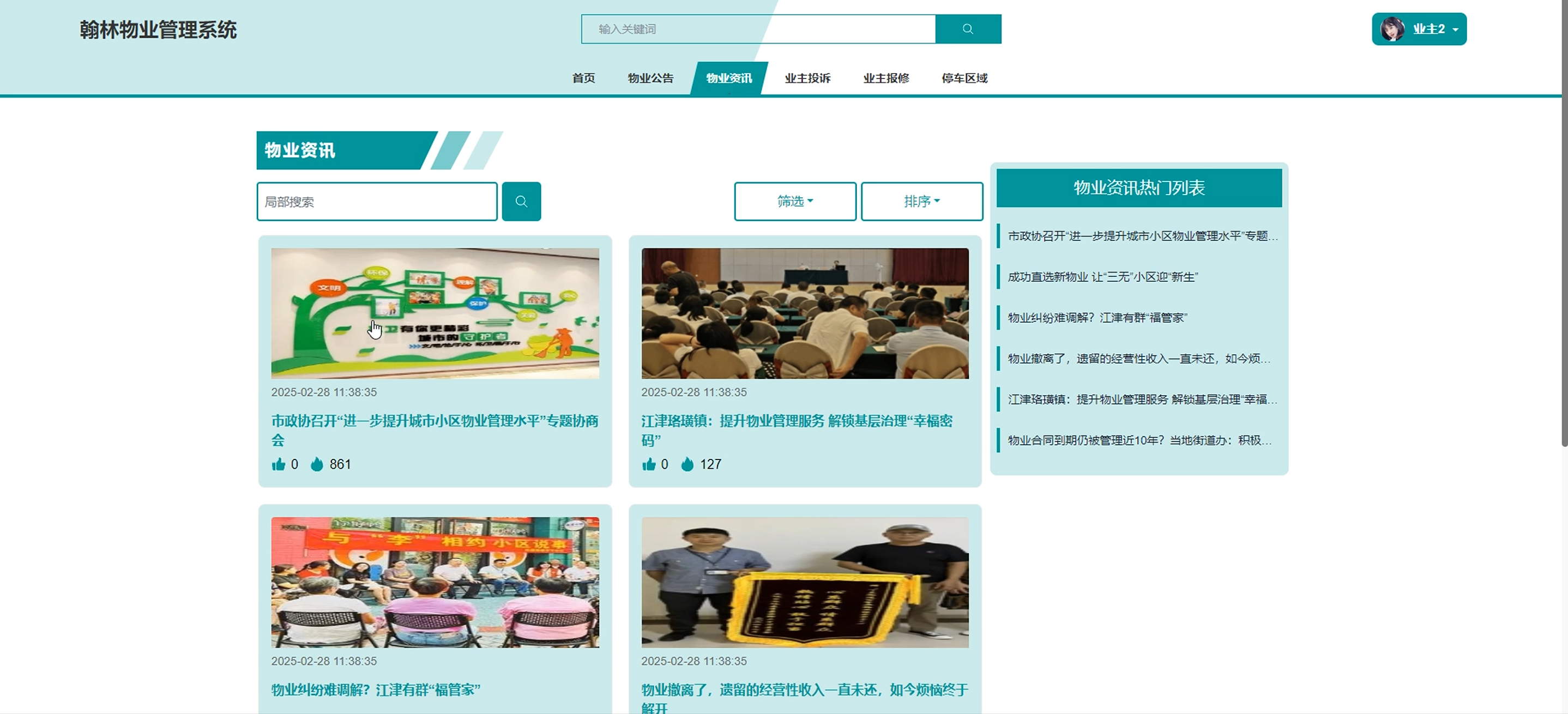 物业资讯:用户能够通过搜索、筛选和排序的方式查找相关的物业资讯然后点击查看详情,并可进行点赞、收藏和评论。