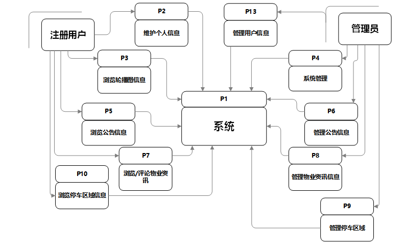 顶层数据流程是指系统与外部实体之间的数据流动,描述了系统的整体数据流。在翰林物业管理系统中,顶层数据流程包括管理员导入或添加停车区域、业主用户查看停车区域、发表评论。