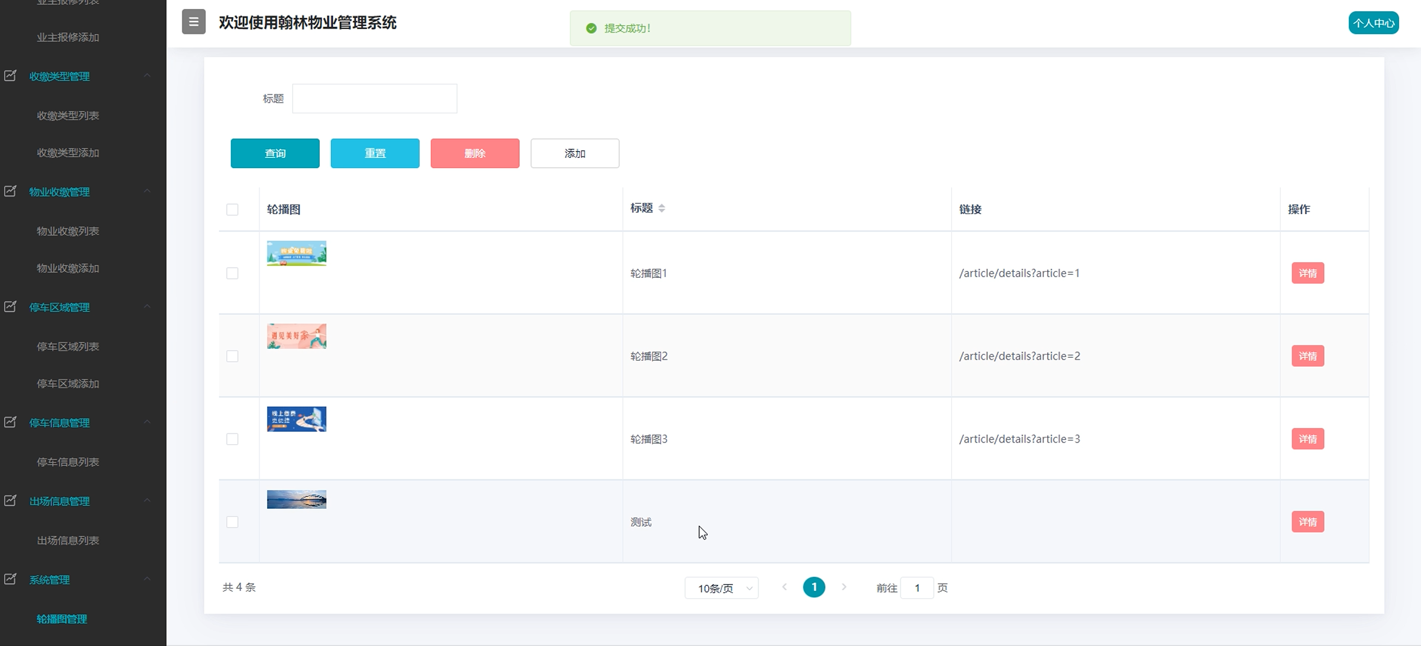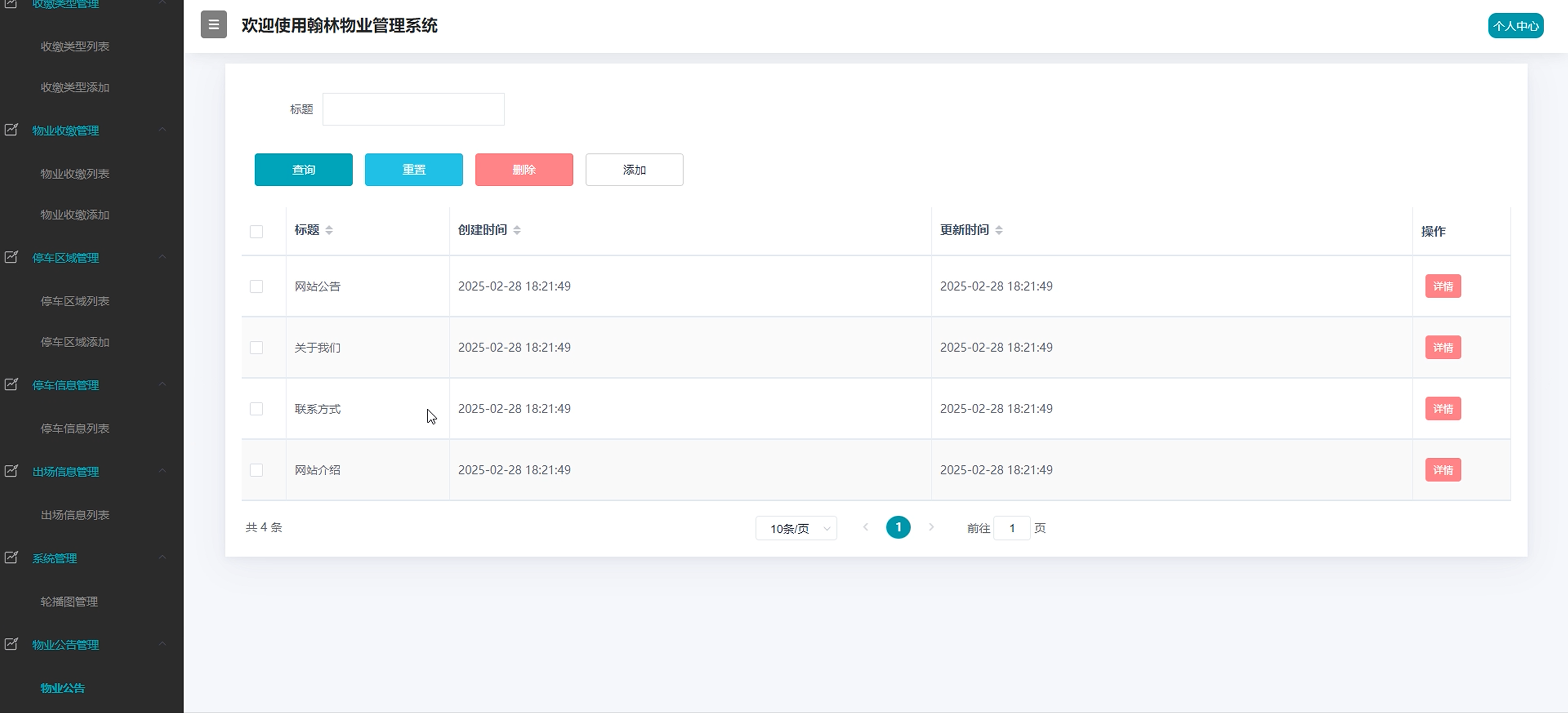管理员可对物业公告进行管理,进行增删改查操作,支持标题搜索,可点击详情进行查阅。其界面如下图所示。
