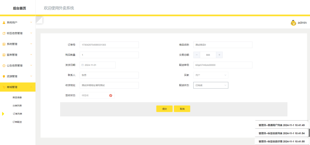 管理员可管理自己的商城信息,包括对菜品信息、分类列表、订单信息、订单配送等信息进行管控。可编辑、发布、删除菜品信息;并且对菜品信息进行分类;处理订单信息,确认和更新订单支付状态,进行配送;更新和跟踪订单配送及签收情况。界面如下图所示。