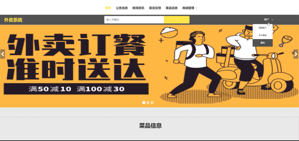 首页:注册用户登录后首先进入前台首页界面,提供系统搜索功能、功能导航栏及菜单信息概览、最新资讯,包括轮播图等。
