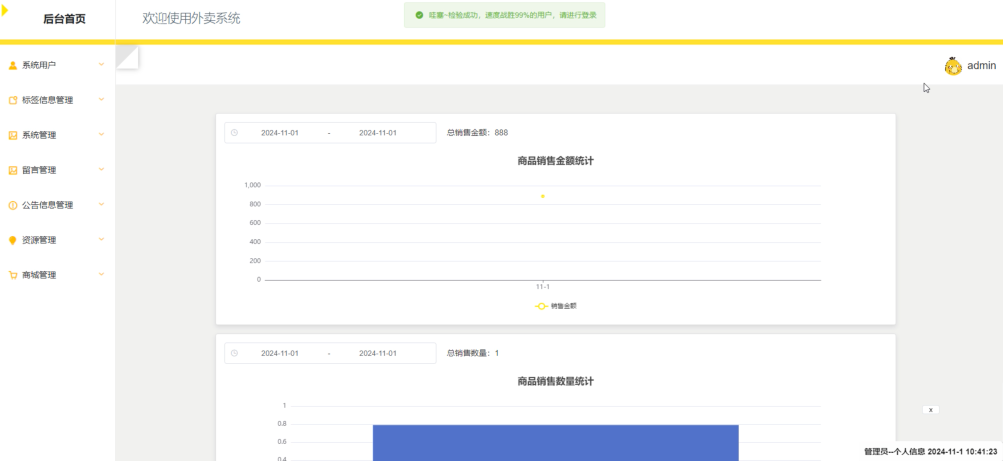 后台首页:管理员登录系统后,首先进入后台首页界面,提供系统重要信息概览、功能导航栏,以及自己内部数据统计信息分析图表,包括商品销售金额、商品销售数量等统计图表。
