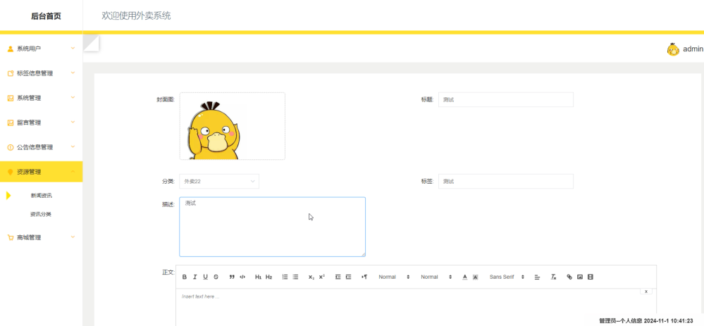 在现代社会中,外卖服务已成为人们日常生活中不可或缺的一部分。在本研究中,我成功构建了一个用户友好、功能全面、操作简单的外送系统,本系统采用前后端分离和模块化设计方式,实现了多元完善的功能如注册、登录、后台首页(数据统计)、系统用户、系统管理、公告信息管理、资源管理、商城管理等功能模块,实现管理和服务全流程,能够很好地满足多用户的不同需求。