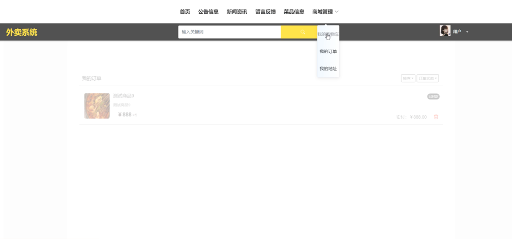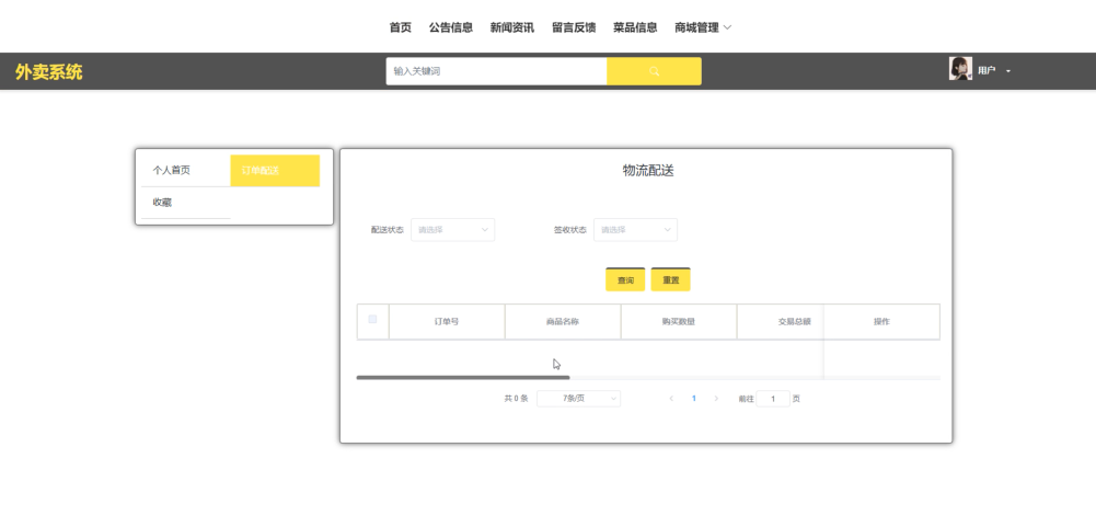 个人中心:注册用户可对个人首页、配送信息、订单配送、收藏管理等信息进行管控。例如,可搜索和查看配送信息(订单开始配送后才有显示);查看和删除收藏的系统信息;管理已发布的评论信息及其回复内容。
