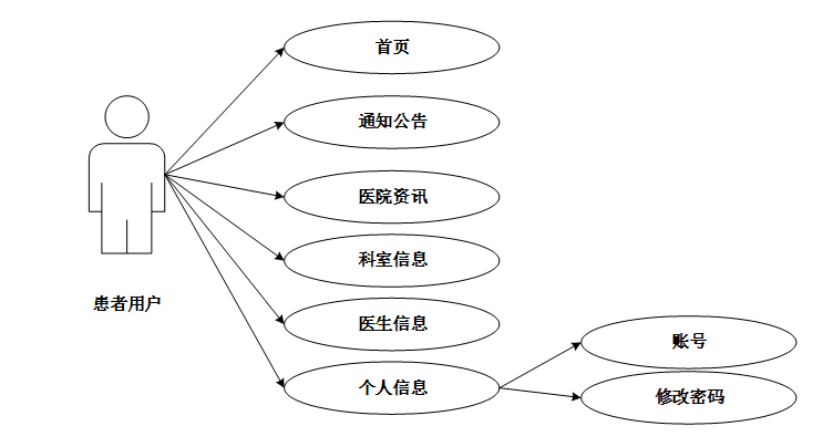 用户可查看住院信息,发起在线咨询,获取认知锻炼信息,查看取消挂号信息,管理收藏信息。用户用例图如图3-1所示。