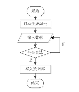 系统开始后自动生成编号,用户输入数据。系统判断输入的数据是否合法,若不合法则返回重新输入;若合法,则将数据写入数据库,最后结束流程。如图3-5所示。