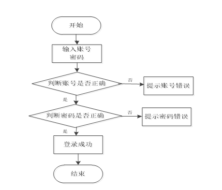 用户输入账号和密码后,系统首先判断账号是否正确,若不正确则提示“账号错误”;如果账号正确,则继续判断密码是否正确,若密码错误则提示“密码错误”;若账号和密码均正确,则显示“登录成功”,最后结束流程。如图3-4所示。