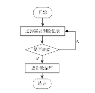 用户首先选择需要删除的记录,然后系统判断是否执行删除操作。如果用户选择不删除,则返回重新选择;如果选择删除,则更新数据库完成记录删除操作,最后结束流程。如图3-6所示。