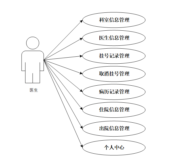 医生可管理病历记录,处理在线咨询,管理认知锻炼信息,管理取消挂号信息,维护自身信息。医生用例图如图3-2所示。