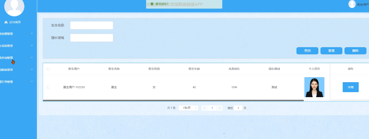 | 查看住院信息功能测试 | 1. 登录系统,进入住院信息页面。 2. 点击医生姓名,进入医生详情页面。 3. 查看医生的详细资料。 | 医生的详细资料(包括姓名、专业领域、从医时长等)正确显示。 | 与预期结果一致 |