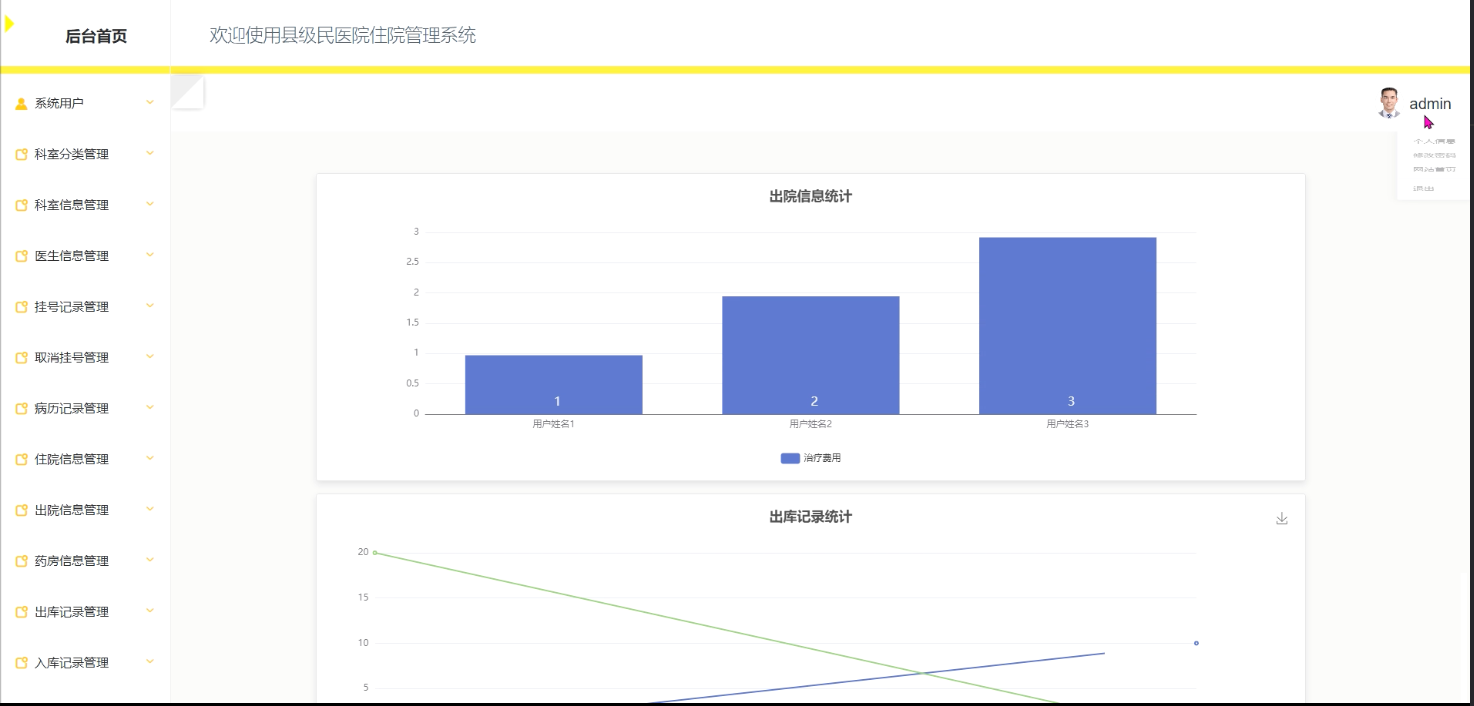 管理员首页提供全面的医院数据统计功能,展示各项关键指标,如挂号量、出院人数、药品库存、财务收入、患者满意度等。通过直观的图表和数据分析,管理员可以实时监控医院运营状况,帮助做出科学决策,并及时调整资源配置和管理策略,提升医院整体运营效率。界面如图5-7所示。