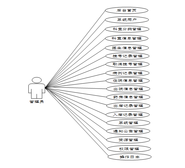 管理员可管理住院信息,处理在线咨询,管理认知锻炼信息,管理取消挂号信息,管理病历记录。管理员用例图如图3-2所示。