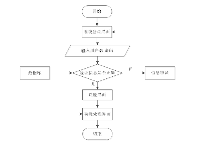 用户从“系统登录界面”开始,输入用户名和密码后,系统验证其信息是否正确。如果验证通过,则进入功能界面并进一步进入功能处理界面,最后流程结束;如果验证失败,则显示“信息错误”,用户需要重新输入。数据库支持验证过程。如图3-3所示。