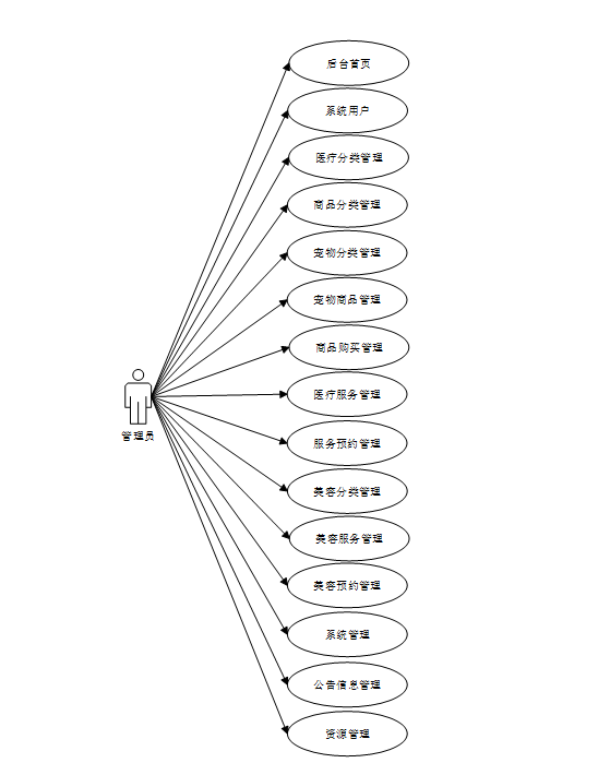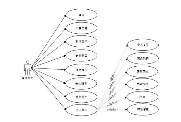 系统用例分析是对宠物管理系统中各个功能模块的用户需求和行为进行分析,以识别和描述不同的用户用例。通过系统用例分析,可以深入了解用户在系统上的操作流程和交互方式,为系统设计和开发提供指导,并确保系统能够满足用户的需求和期望。