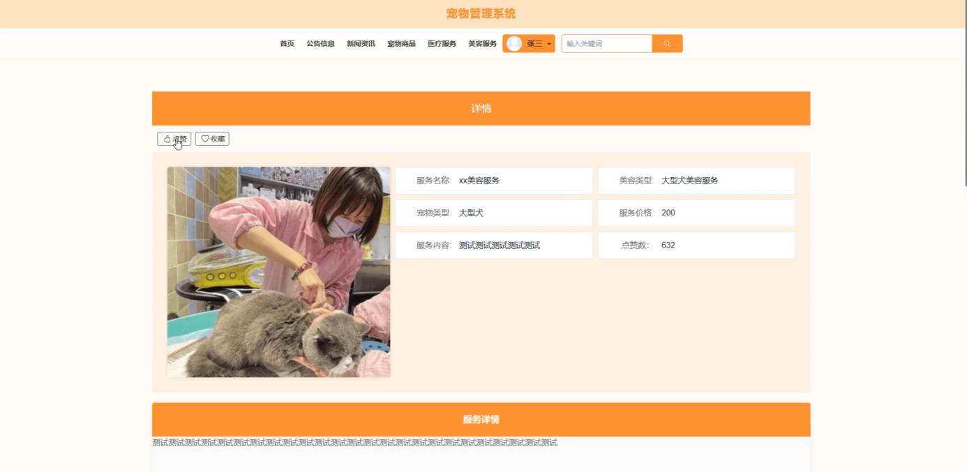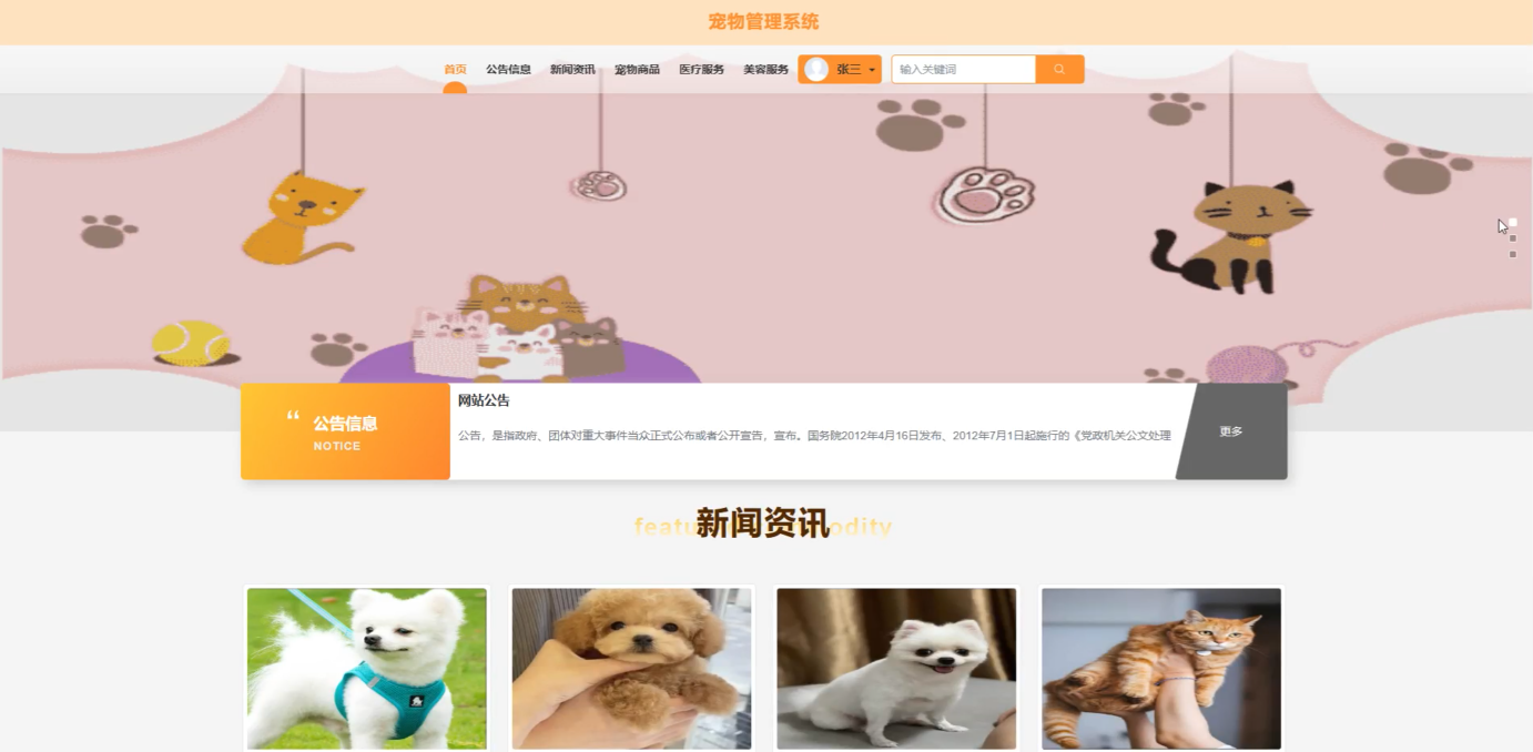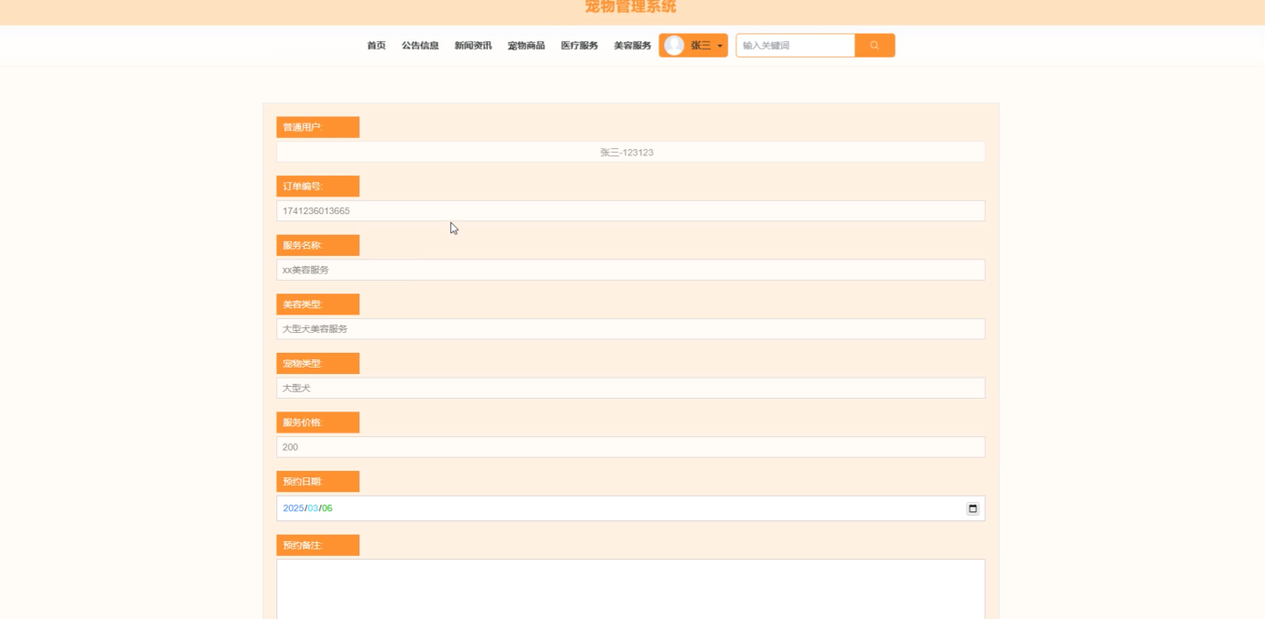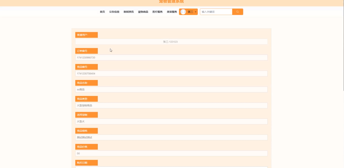 The system realizes multi-functional services including ordinary users and administrators. Ordinary users can browse the homepage, view announcement information, read news information, buy pet products, make appointments for medical services and beauty services, etc.; Administrators can carry out background management, covering system user management, category management, goods and services management and other aspects. Technically, the Python language is combined with the Django framework, and the MySQL database is used to support the data storage and processing needs of the system.