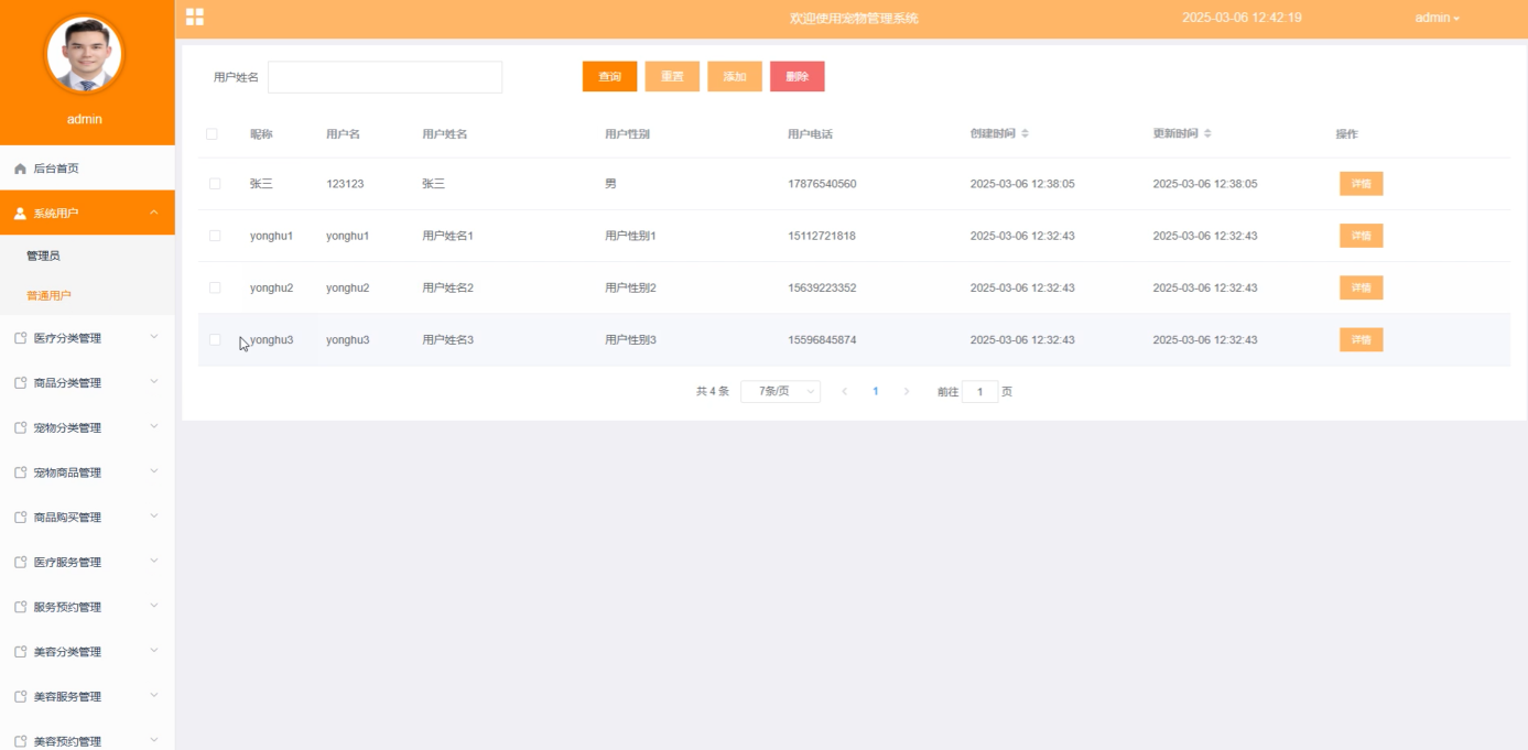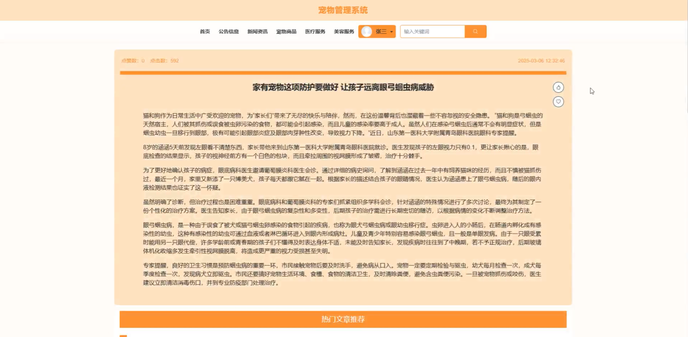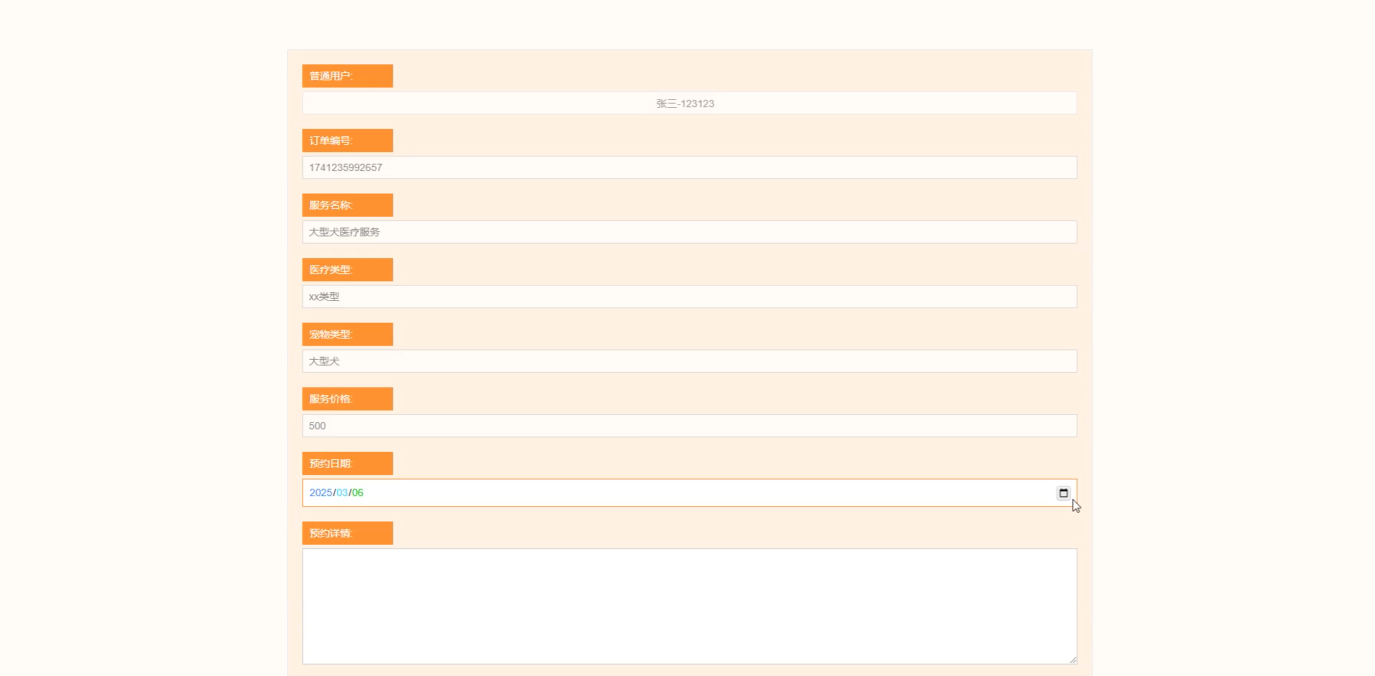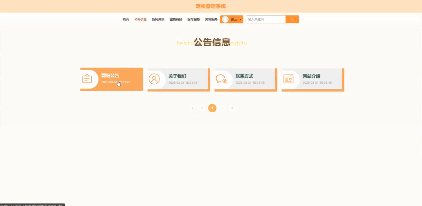 The system realizes multi-functional services including ordinary users and administrators. Ordinary users can browse the homepage, view announcement information, read news information, buy pet products, make appointments for medical services and beauty services, etc.; Administrators can carry out background management, covering system user management, category management, goods and services management and other aspects. Technically, the Python language is combined with the Django framework, and the MySQL database is used to support the data storage and processing needs of the system.